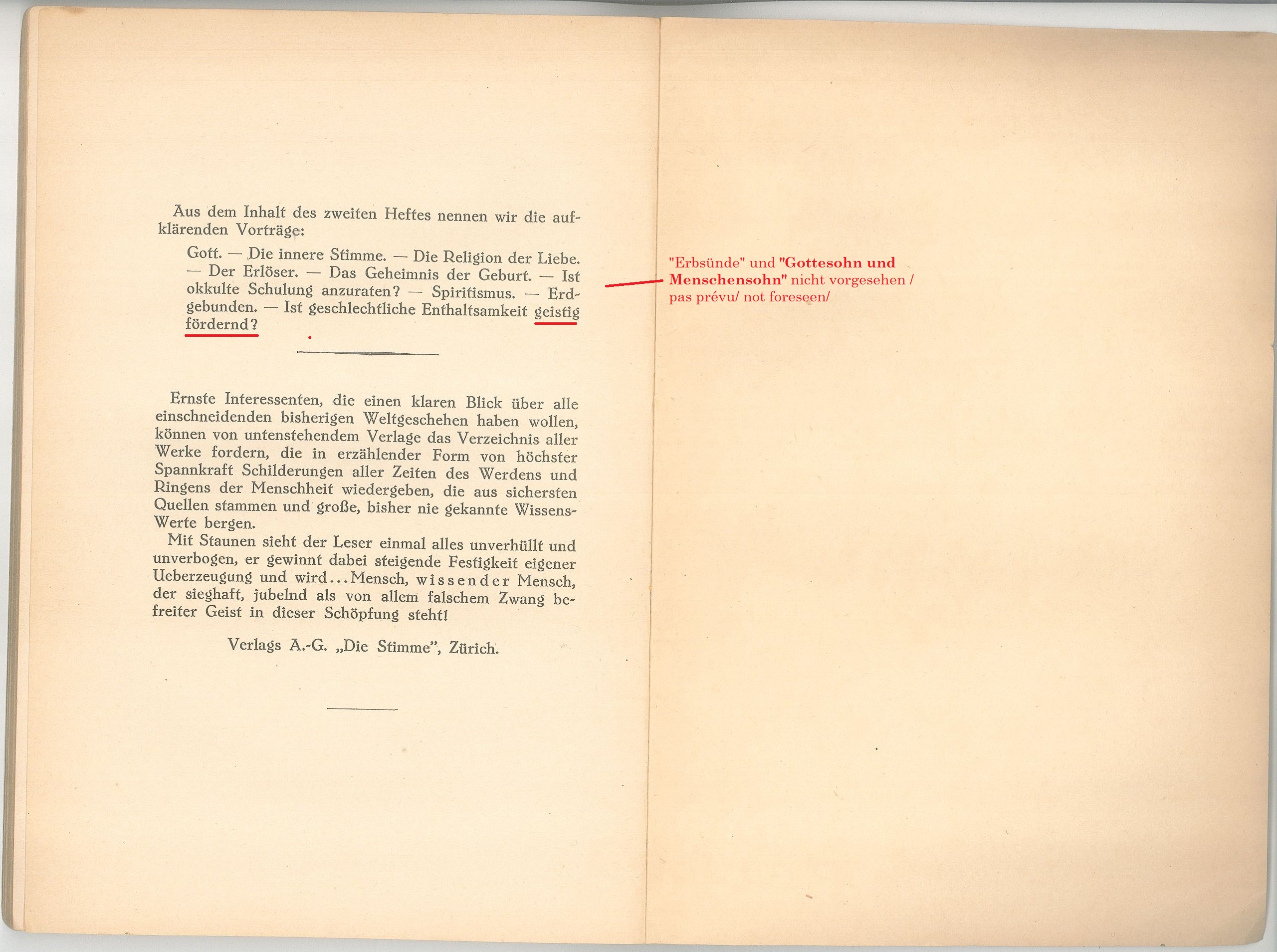 "Im Lichte der Wahrheit" Heft 1, Verlags A-G "Die Stimme" Zurich.